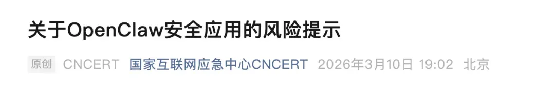 3月10日,国度互联网救急中心发布对于OpenClaw安全应用的风险指示: