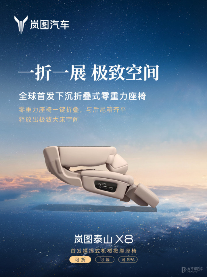 算作了解,泰山X8搭载同级私有的双向16度后轮转向、三腔空气悬架,配备二排双享零重力座椅、2.1米全自动一键成床功能、896 线四激光雷达与华为新一代智能座舱。