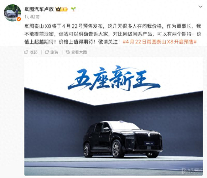 【太平洋汽车 新车频谈】4月20日,岚图汽车董事长卢放通过个东谈主搪塞平台发文恢复价钱臆想,明确岚图泰山x8价值上很是期待,价钱上值得期待。