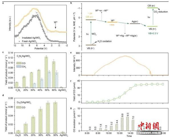 基于这一思路,研发团队成功构建出具有电子存储功能的银修饰三氧化钨材料,通过将其与催化活性组分酞菁钴复合进行验证,测得二氧化碳转化效率较纯酞菁钴提升了近百倍。同时,新方案具备良好的通用性与适用性,可根据实际需求构建多种结构适配的复合催化剂体系。更重要的是,该方案在自然光条件下运行稳定,为利用太阳能规模化转化二氧化碳、生产一氧化碳和甲烷等清洁能源提供了可行的技术路径。