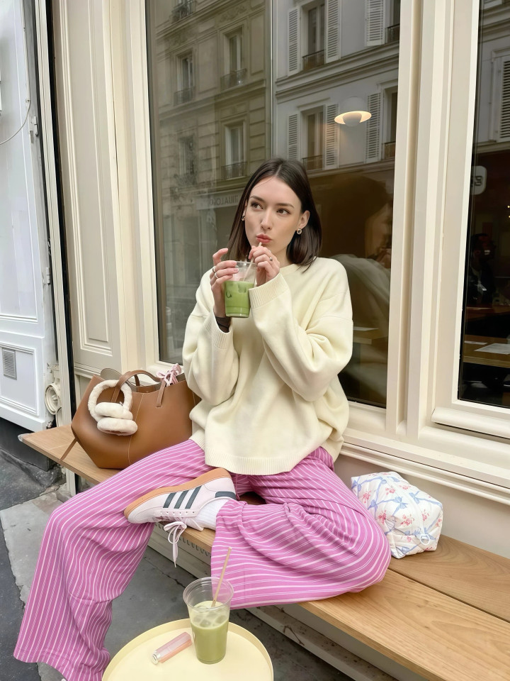 粉色和白色放在通盘的工夫,白色充任的变装是“留白”,它让粉色有了呼吸的余步,不会满眼都是粉到让东说念主有点腻,上半身一件白色或然米白色的毛衣,下半身配一条粉色的阔腿裤或烟管裤,整套搭配干净得很,穿去上班也不突兀。