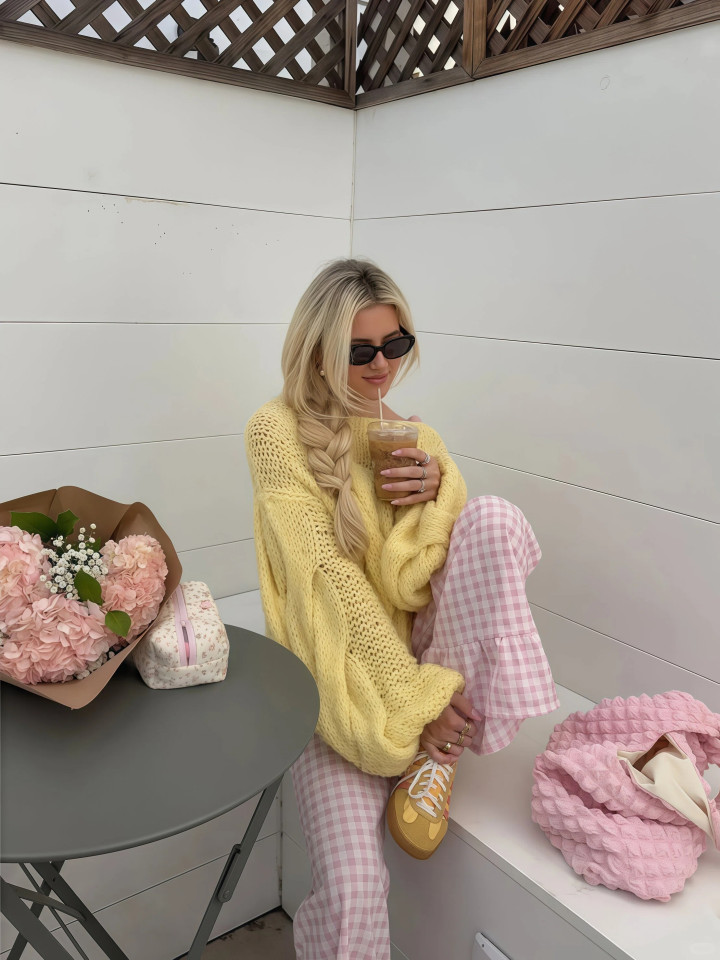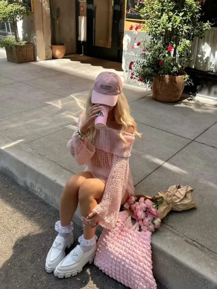 你可以去试试粗棒针编织或然马海毛材质的粉色毛衣,粗棒针的纹理给粉色增多了一层肌理和厚度,让这个情态看上去更有重量、更塌实,而马海毛自带的蓬松毛感则让粉色变得更柔更暖,穿上身以后多了几分温度。